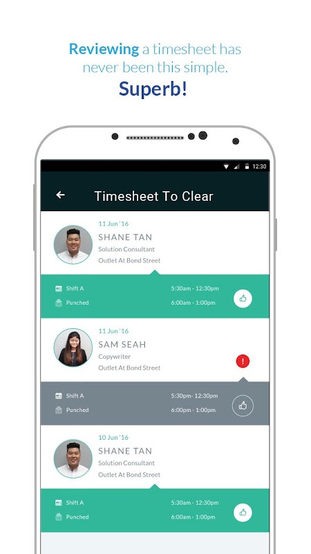• Review timesheets continuously with one tap (where required)