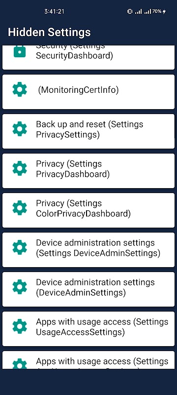 隱藏的應用程序設置或 android 隱藏設置此應用程序允許您打開某些手機供應商對用戶隱藏的 android 設置。 MIUI 的隱藏設置。此應用程序僅向您顯示適用於您設備的可用選項。應用程序使用未記錄的有關 android 系統的知識,因此並非所有設置都適用於您的手機。這個應用程序是一個工具,可以讓你打開一些手機供應商為用戶隱藏的一些實用的安卓設置。