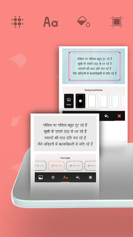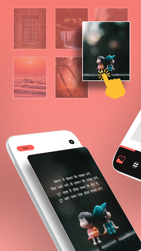 Select your favourite shayari, edit selected shayari by changing different background - cool fonts - fonts size - fonts colors, also edit word of shayari and by just one click share it via any Whatsapp, Facebook, SMS, Instagram, etc.