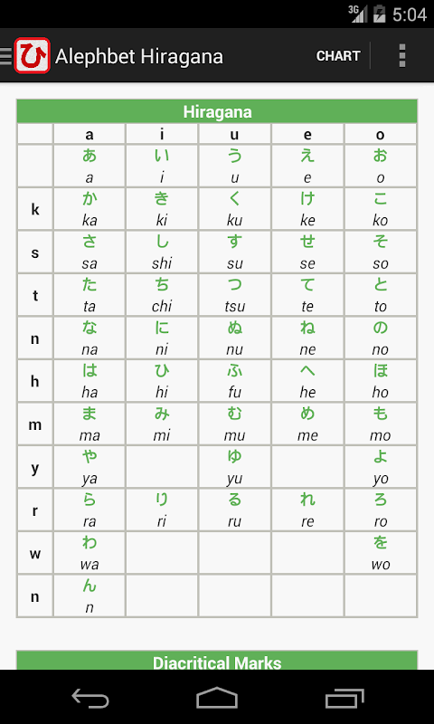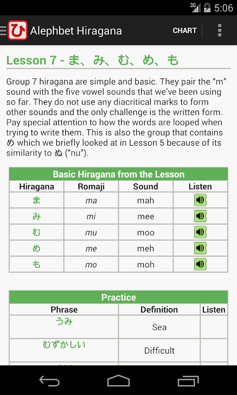 學習平假名並不困難,如果你逐步了解它。太多的人試圖填滿一切在一夜之間;他們感到沮喪,或者他們在一個星期忘了。 Alephbet平假名包含設計來讓你閱讀完整的單詞和短語有組織的教訓,你去了會給你你需要堅持下去的做法。當你每節課後,進入練習,您可以輕鬆而自信地讀取只包含平假名你學會為止的話。