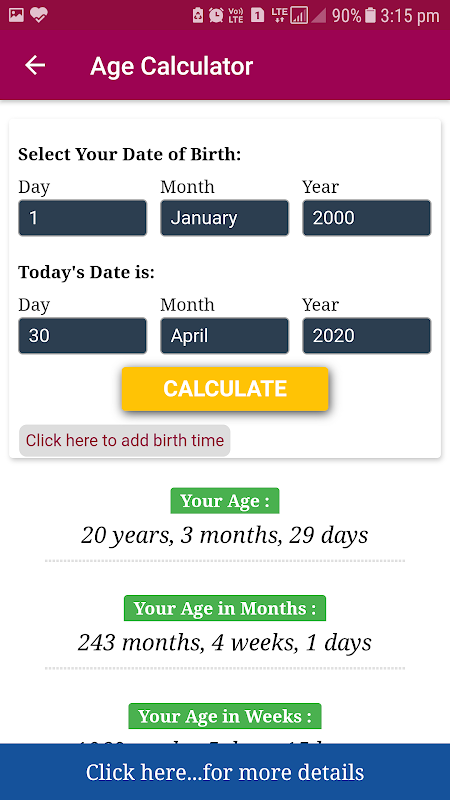 If you have question like, How to age calculation? in your mind. Then this app will answer all your question. This app will help you calculating your age in terms of years, months, weeks, days, hours, minutes and even in seconds. Various information regarding your age is displayed as following: