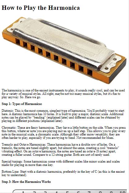閱讀樂譜:學習閱讀口琴樂譜(樂譜),一種代表口琴上每個孔的簡化記譜系統。選項卡指示要吹製或繪製哪些孔,並且可能包括彎曲、八度音階和其他技術的符號。
