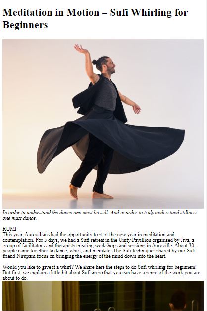 表達感激和臣服:蘇菲旋轉是一種臣服和對神的奉獻的行為。對運動的禮物和透過舞蹈與神聖聯繫的機會表達感激之情。讓自己完全臣服於旋轉運動,相信練習的改變力量。