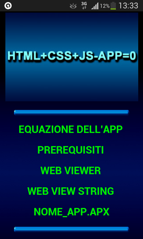 知的HTML,CSS和Java腳本,你可以創建一個Android應用程序忽略了幾乎全部Java語言。在JAVA語言只用於生成文件nome_app.apk表示文件將被出版在不同的移動設備,其中的app_name是通過給予所述移動應用的名稱來代替。