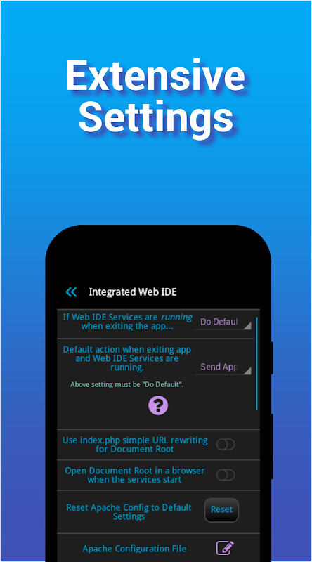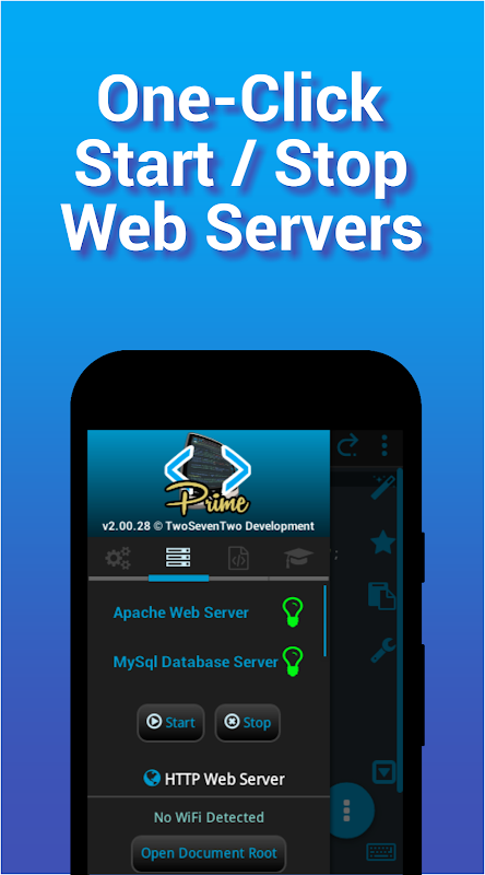 • Map folders to a virtual host ( * Web project) and edit/run a full PHP based site on your mobile. Code is easily edited and tested without having to upload to a server.