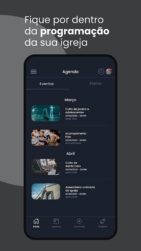 應用程序中提供的資源:新聞、教會議程、活動、內容、項目、直播和教學模塊。