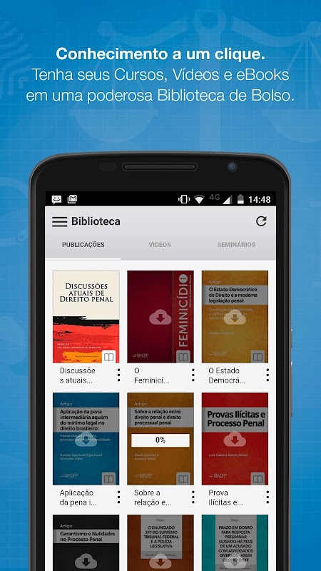Além de comportar eBooks em formato ePub, a aplicação possui acesso a notícias, cursos e palestras online. Ao assinar a APP IBADPP em seu device você ganha o acesso a diversos conteúdos. Todas as ‘interferências’ feitas nos conteúdos disponibilizados em nossa plataforma podem ser sincronizados em qualquer outro dispositivo; tablet ou smartphone. Nosso objetivo é facilitar o conhecimento e o acesso a informações relevantes no âmbito do Processo Penal.