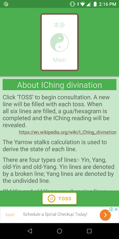 這個應用程序也有一個占卜頁面,你可以用六卦閱讀進行六次投擲。每個六芒星包含關於占卜的整體觀點/判斷(卦辭);象徵主義陳述(象辭與上八卦八卦有關);和一個簡短的卦語(彖辭tuàn)。