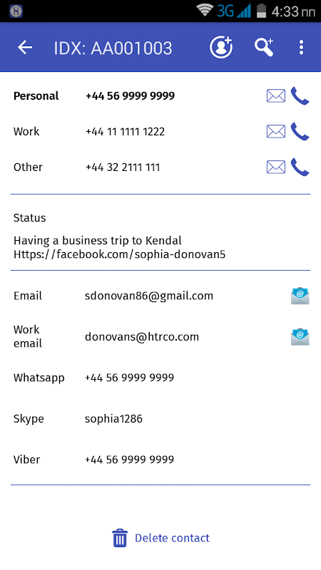 IDEX - Новый способ обмена контактами. Процесс обмена контактами при помощи IDEX ID намного быстрей и удобней традиционного обмена телефонами, поскольку обмен происходит сразу всем данными, которые есть в профиле, это могут быть сразу несколько телефонных номеров, e-mail и прочих данных, таких как фотография или комментарий. IDEX снижает вероятность ошибки - не надо перезванивать и проверять правильность записи телефона, не надо записывать имя и добавлять фото - все это происходит автоматически при обмене IDEX ID. Также решается проблема смены номера телефона - при смене номера телефона в своем IDEX профиле, он сразу обновится в IDEX друзей. Плюс данные хранятся на сревере, и Вы не потеряете контакты при потере или поломке телефона. Регистрируйтесь, получайте свой IDEX ID и добро пожаловать мир с IDEX!