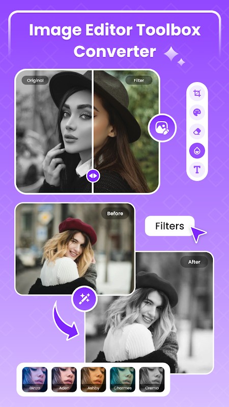 影像編輯器工具箱轉換器,用於增強、調整大小和自訂影像。