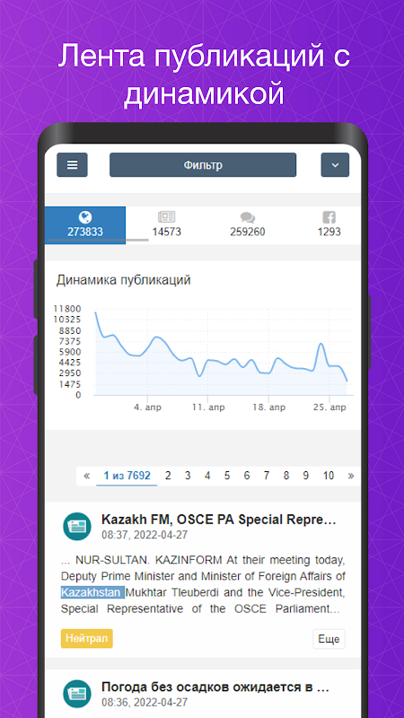 iMAS(信息監控和分析系統)是一個使用最新技術收集和處理信息的媒體、社交網絡、博客、網絡資源、論壇和即時通訊程序的自動監控系統。該系統以 24/7/365 格式實時監控哈薩克斯坦的所有媒體 (4000+) 和來自 150 個國家的世界媒體 (30,500+) 以及社交網絡:Facebook、Vkontakte、Instagram、Twitter、 Odnoklassniki、Youtube、Telegram、Tik Tok 等。