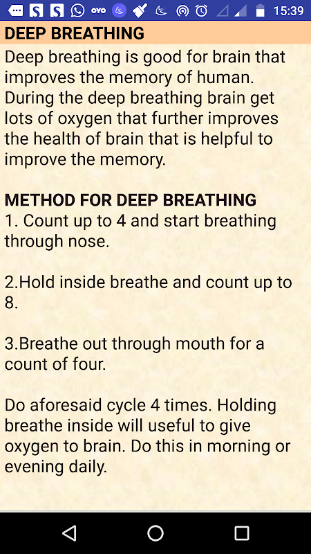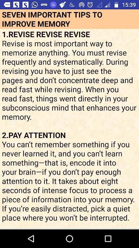 在這個Android應用程序中已經討論了提高內存的技巧。集中註意力是提高記憶力的最佳方法。提高思維能力也有助於提高記憶力。該應用程序討論了有關冥想,大腦增強飲食,高濃度,漸進放鬆等有助於改善記憶的主題。