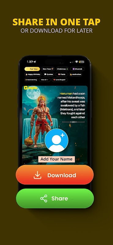 獲得關於生活、節日、印度文化、印度教神、名人、偉大哲學家和作家的名言,所有這些都可以個性化定製成帶有你的名字和照片的狀態消息。我們不僅限於照片,InPix 還提供各種類型的影片狀態內容。無需使用其他圖片編輯應用程式為圖片新增文字,只需輕按一下即可分享。