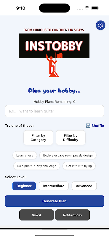 只需輸入您感興趣的內容(無論是“木工”、“繪畫”、“攝影”,甚至“學習吉他”),Instobby 就會立即產生一個結構化的 5 天入門計劃,其中包含您開始所需的一切。