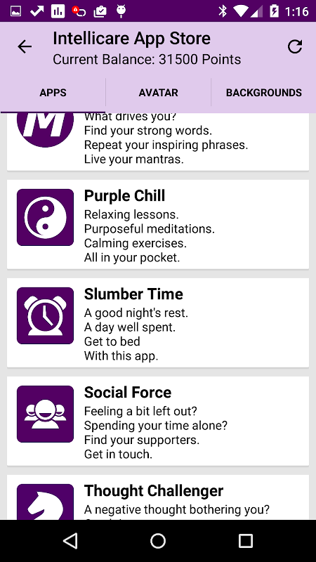 The IntelliCare app manages incentives, notifications, communications and updates for all the apps in the IntelliCare suite. Personalize the app with your own style using points earned in the other IntelliCare apps and make sure you never miss a thing.