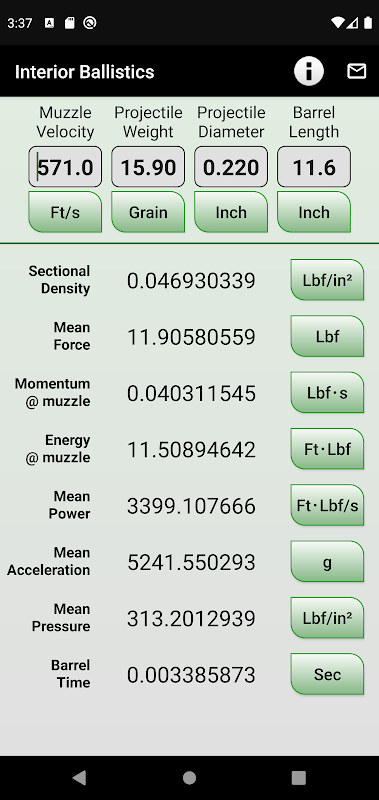 考慮到彈丸重量和直徑、初速和槍管長度,此應用程序詳細介紹了彈丸的截面密度以及相關動力學:
