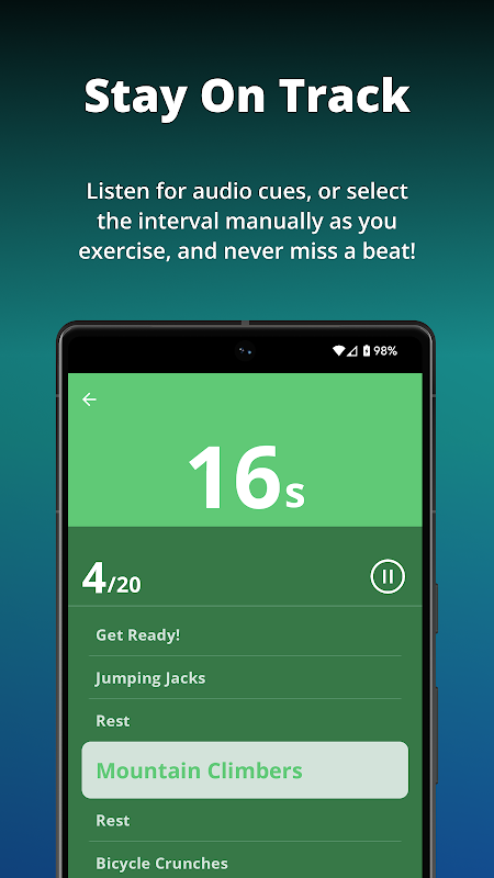 音訊和視覺提示:透過音訊和視覺提示引導您完成每個間隔,在運動期間保持積極性和專注力。當需要工作、休息或在運動之間轉換時接收提醒,確保您保持正軌並最大限度地提高結果