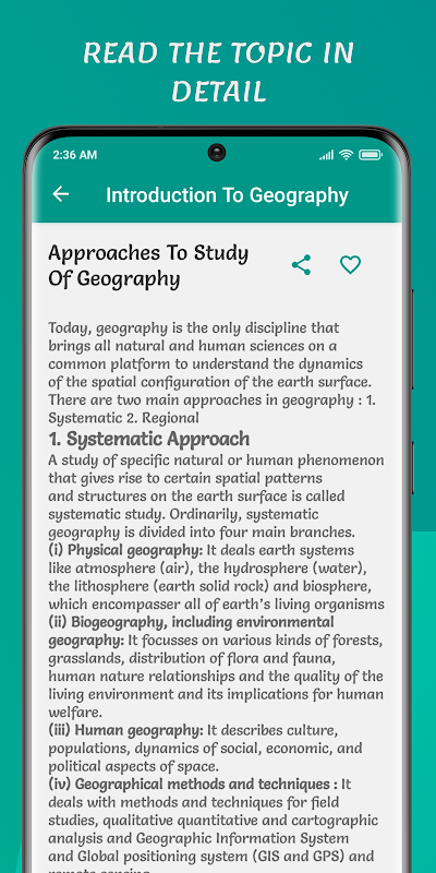 這個應用程序對所有學習地理或從事地理研究的人都非常有用。該應用程序可用於從第 7 標準到 M.Phil 或 D Phil。等級。該應用程序為那些準備競爭考試的人提供了方便的知識。當然,沒有任何應用程序可以取代老師,但它仍然為學習者提供了生計。主要的好處是,這個應用程序不需要互聯網連接來工作,即它可以離線工作。