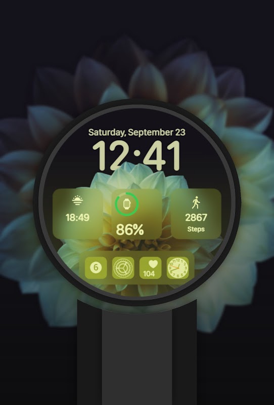 ◉ 應用程式底座帶有旋轉設定、工作時鐘圖標和健康圖標