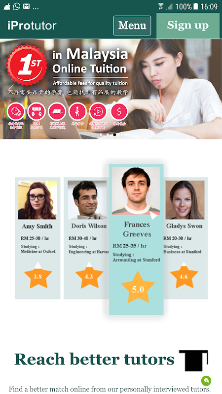 通過我們的網站,學生可以在預算範圍內建立自己的等級要求,並比較導師的個人資料,以選擇適合自己需要的最佳。學生/導師可以使用我們集成的在線日程安排工具,並推出虛擬白板教室,提供現場通信工具(白板,音頻,視頻,聊天),桌面共享,文件和保存導師會議。
