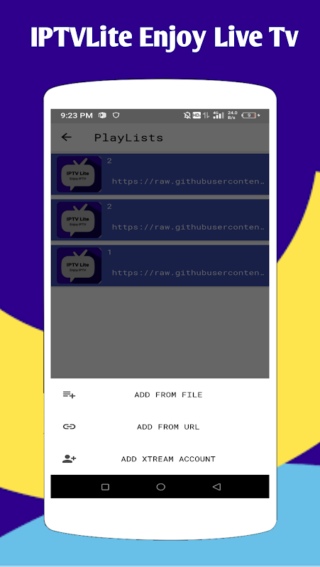 Add any IPTV (.m3u file) (.m3u url) (Xtream Account) through the IPTV Lite - Enjoy Live Tv app