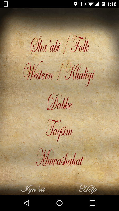- 包含5節奏類別包括Sha'abi(民歌),Khaligi,狄布開步,Taqsim和Muwashahat。