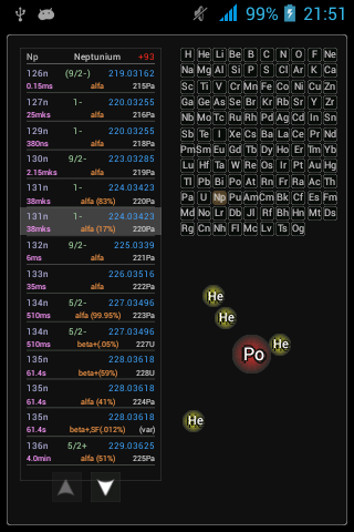 The application contains a list of all the main isotopes of chemical elements, their half-lives. Selecting any of them from the list, the program will show the products of its decay. The program allows you to see more qualitative questions about isotopes in order to understand their diversity in terms of number and decay products. The program is useful for those who are interested in atomic physics.