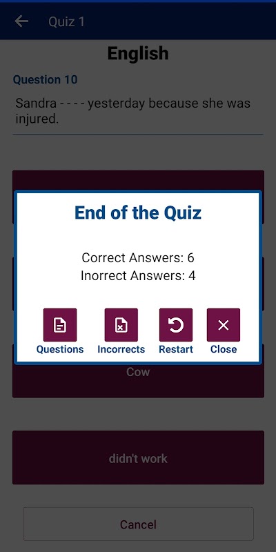 當您完成測驗的答案時,系統會顯示給您多少正確和不正確的答案,您還可以看到所有測驗中的問題,並查看其中輸入有誤的問題以及正確答案,然後嘗試再次或返回主菜單。