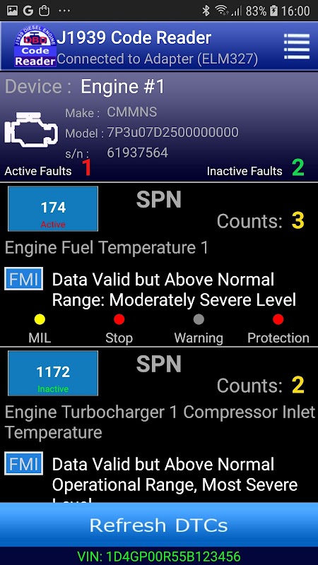 現在您可以使用應用程式的所有功能,例如讀取故障碼、清除故障碼(如有需要)、尋找 PGN 或查看引擎即時資料…