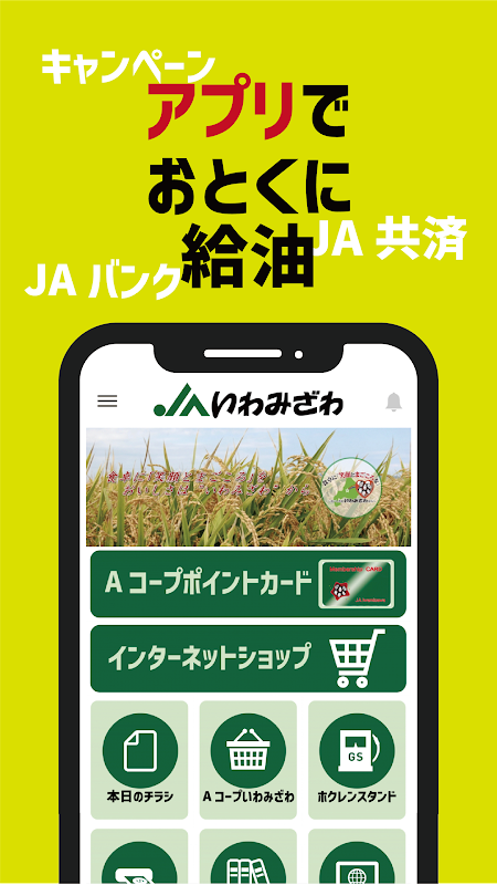 最新情報・お得な情報満載の「JAいわみざわ」公式アプリをダウンロードしていただき、Aコープでお得なお買い物やJAスタンドの最新の給油価格情報、JAで実施するキャンペーンなどの情報もご覧いただけます。