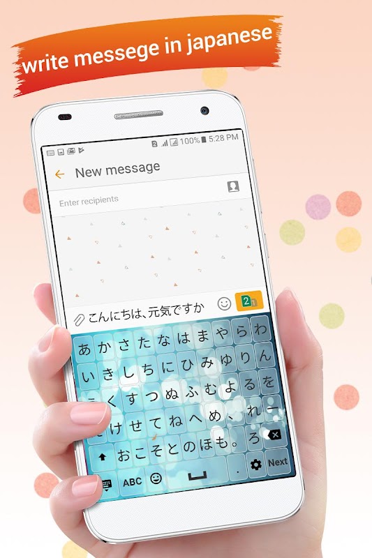 With the help of Japanese keyboard you will write in Japanese language. You can write emails and update your status on all social platforms. you can use Japanese keyboard with all messenger apps to write messages in Japanese language through Japanese typing app. By Japanese Keyboard you can write in Japanese language in your cell phone
