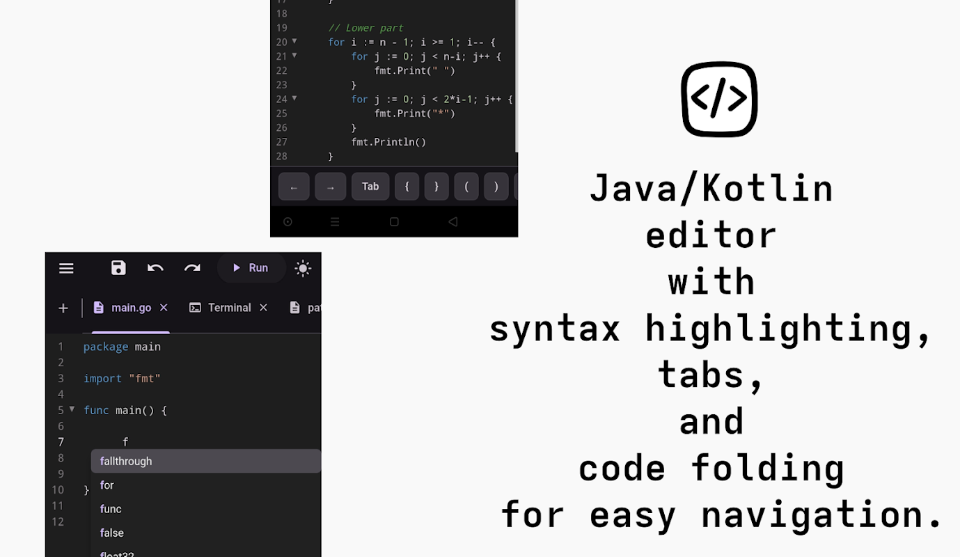 無需網路連接,即可在您的手機或平板電腦上編寫、編譯和運行 Kotlin 和 Java 程式。