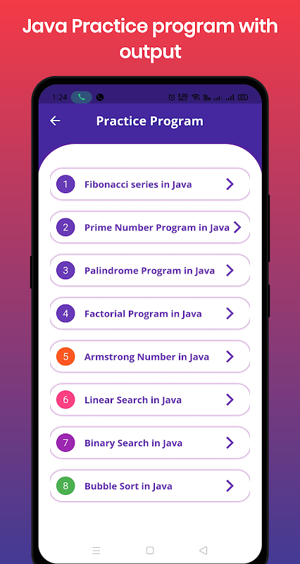 In this Java Programming app, you can find Java Programming Basic Tutorials, Advanced Tutorials, Practice Programs, Questions & Answers and all that you need to either learn Java programming basics to advanced to become a Java programming expert. With a wide collection of hundreds of programs (code examples) with comments, multiple questions and answers, all your programming learning needs are bundled in a single code learning app.
