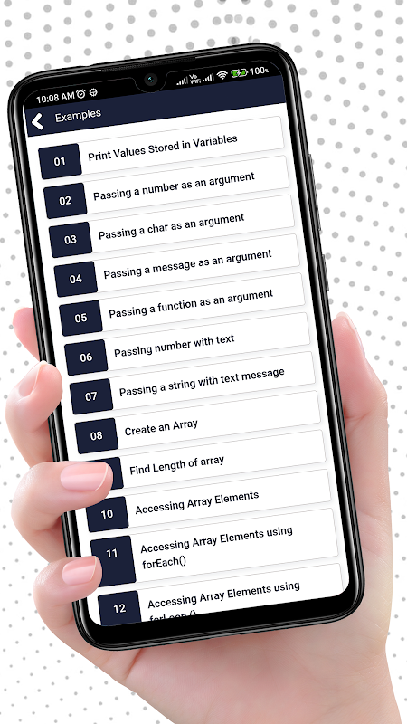 Javascript Console也可以稱為js控制台,在應用程式中我們設計了javascript編譯器來編譯任何類型的javascript程式碼。此外,這個學習 javascript 專業版應用程式還提供了一些範例,方便使用者學習和理解。這樣使用者就可以在兩天內輕鬆學會javascript程式設計。