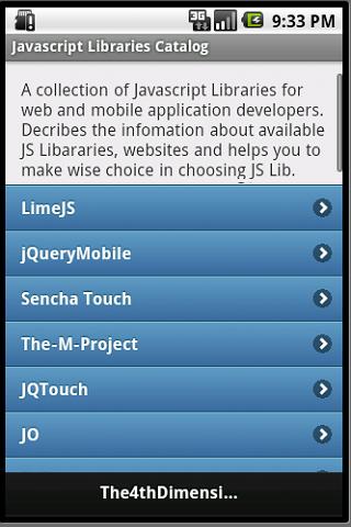 Some of the famous libraries for mobile app development like jQueryMobile, Sencha Touch, JQTouch are listed in the snapshot. This app provides information such as