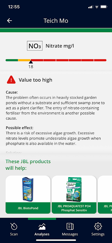 使用隨附的專門校準的 JBL PROSCAN 色卡並按照應用程序中的說明進行操作。在“分析”下,您可以管理您的水族館和池塘,並在圖表中比較測量值。您現在可以通過您的 myJBL 個人資料從世界任何地方訪問這些數據 - 即使沒有智能手機。如果沒有 myJBL 配置文件,最後一次測量僅在本地保存在應用程序中。在這裡也可以不受限制地進行帶有行動建議的測量和評估。應用程序中提供以下水類型:“水族館”、“池塘”和“水”。如果您選擇水族箱和水,應用程序會根據應用程序測量的 pH 值和 KH 值計算當前的 CO2 含量,作為獎勵。