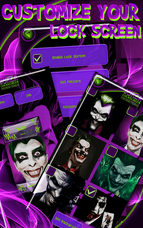 在您的屏幕鎖定應用程序上永遠笑起來,並與您最喜愛的漫畫人物一起微笑!給自己帶來Android的趣味主題!美國DC漫畫超級反派 .安裝小丑鎖,並有一個屏幕按鈕!不是太酷了嗎?忘記關於拉鍊拉鍊鎖屏,全屏屏幕上的手錶小丑!小丑表情符號圖案鎖屏為您的桌面定制提供各種鎖屏壁紙。在這個免費的移動應用程序鎖屏幕個性化,你會發現很多有趣的小丑主題。小丑自己現在輸入小丑號碼密碼來激活保護!