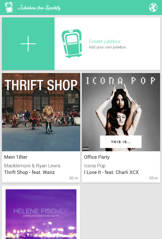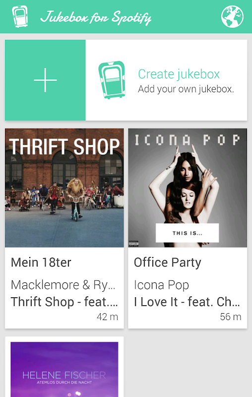 Whether at a private party, in a club, at a wedding, in a pub or at any other event - with Jukebox for Spotify you have access to all tracks listed in the Spotify library. No more need for mp3s, iTunes, YouTube, CDs or records. All you need is your Smartphone or your Tablet and an internet connection. Sign in with your Spotify Premium account, create a jukebox and start the party. Or you can choose the nearest jukebox and make sure that the right music is played.