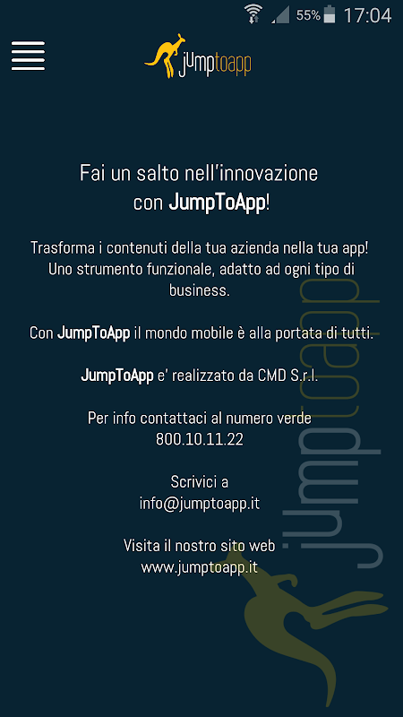 Scarica l’app DEMO che permetterà di entrare in JumpToApp, un servizio innovativo di sviluppo app per mobile che consente di comunicare in modo immediato ed efficace con i tuoi utenti senza il bisogno di possedere alcuna conoscenza informatica.