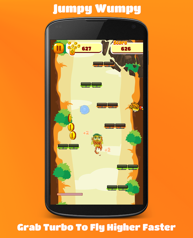 Jump Wumpy Jump! Your goal is to take your Jumpy Wumpy as high as you can. Avoid or destroy the evil plants and birds. Get amazing power ups. Grab shield to protect yourself. Grab turbo power up to fly up twice the speed. Collects coins and use them to get and upgrade boosts. Watch out for the moving and breakable platforms.