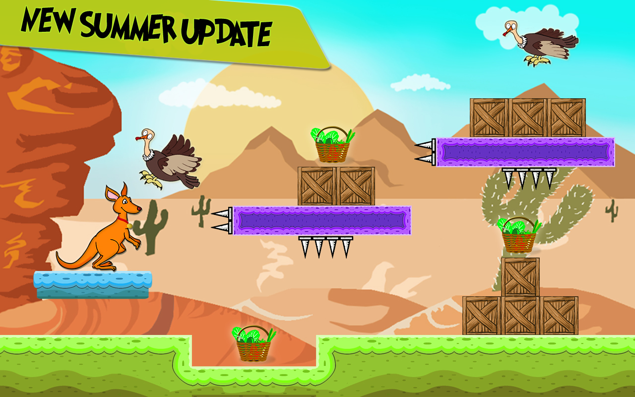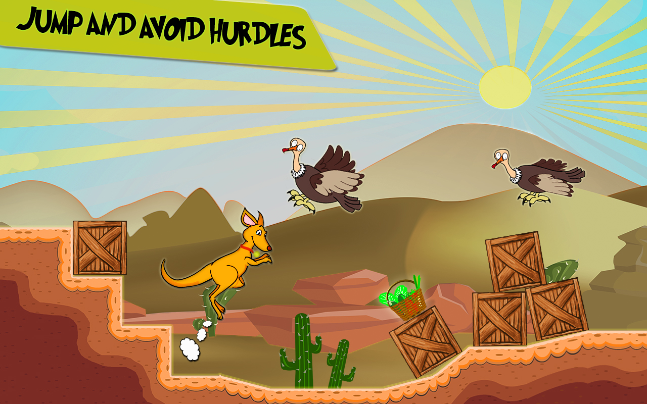 The world of this 2D game is set in the vast land of wild African jungles and the scorching deserts of Australia. Take control of a wild kangaroo who got separated from its family and herd. The goal of the game is to reach your family while avoiding obstacles and enemy predators in your way.