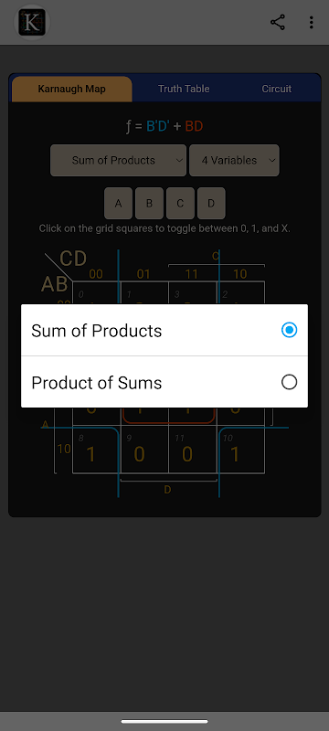 指定變數數量:定義布林函數中的變數數量。該應用程式支援 2 到 5 個變數的卡諾圖。