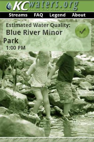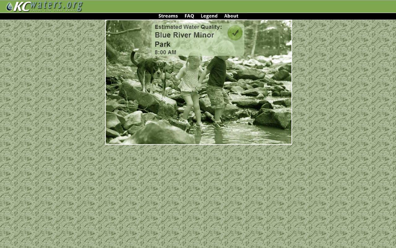 KCWaterBug is an application developed by KCWaters.org, which provides hourly updates of water quality at numerous streams throughout the Kansas City metropolitan area. The application provides a color coded alert based on an estimate of the amount of bacteria that may be found in a particular stream using known relationships between bacteria concentrations and basic water quality parameters.