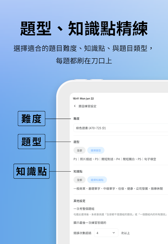 精準刷題:可依照題目難度、知識點與題型進行篩選,提升針對性練習