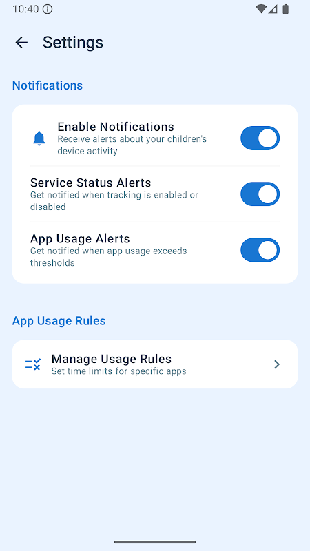 該應用程式旨在提高家長對孩子使用情況的了解和透明度,不會阻止應用程式、限制使用時間或監控內容。