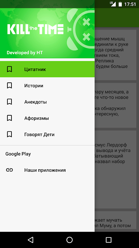 Приложение Kill The Time позволяет загружать и читать развлекательный контент из сети Интернет. Используются пять популярных источников: Цитатник, Истории, Анекдоты, Афоризмы, Говорят Дети. Простое и красивое приложение без рекламы и с материальным дизайном поддерживает копирование целого сообщения по одному клику, чтобы вы могли делиться понравившимися вам цитатами с друзьями через различные мессенджеры и социальные сети. Обновление доступно по движению свайп (движением пальца сверху вниз по экрану телефона), а чтение возможно и в местах, где нет сети или плохой интернет. Поэтому наше приложение скрасит ваше время и поднимет вам настроение в метро или другом общественном транспорте, в очередях или просто, когда у вас будет свободная минутка.