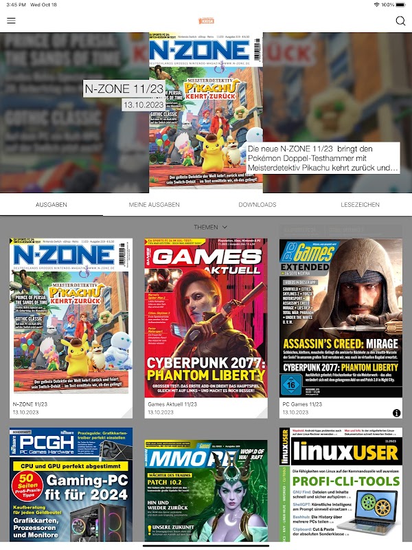 精選的 Computec 雜誌合併在一個資訊亭應用程式中。這些是純電子紙版本,可以縱向和橫向格式瀏覽。您可以選擇雜誌《PC Games》、《PC Games Hardware (PCGH)》、《N-ZONE》、《PC Games MMORE》、《Games Aktuell》、《play5》、《Linux Magazine》、《LinuxUser》、《Raspberry Pi Geek》和特刊。