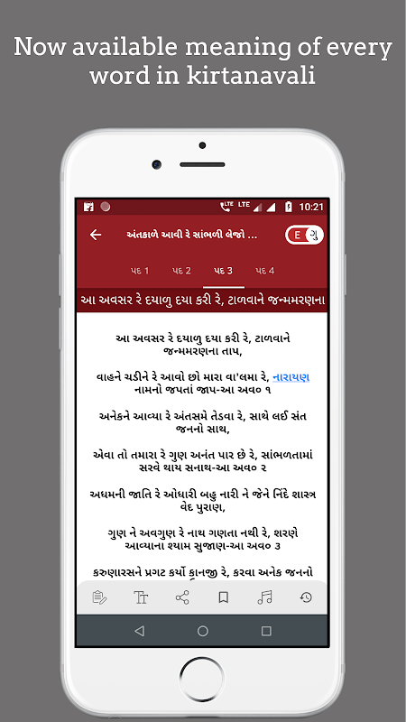 在Bhagwan Swaminarayan神聖存在期間,許多Nand Saints非常親切地創作了許多歌詞:讚美詩和靈歌,如Prabhatiyas,Aarti,Astakas,Nitya Niyamas,以及Bhagwan的偶像和Lila Charitras的讚美詩。為了幫助奉獻者,Shree Swaminarayan Gurukul Rajkot Sansthan付出了巨大的努力來收集和編譯3000多個Kirtans的數據庫。這些Kirtan使用古吉拉特語和音譯英語(Lipi),因此無法閱讀古吉拉特語的信徒也可以利用此應用程序。