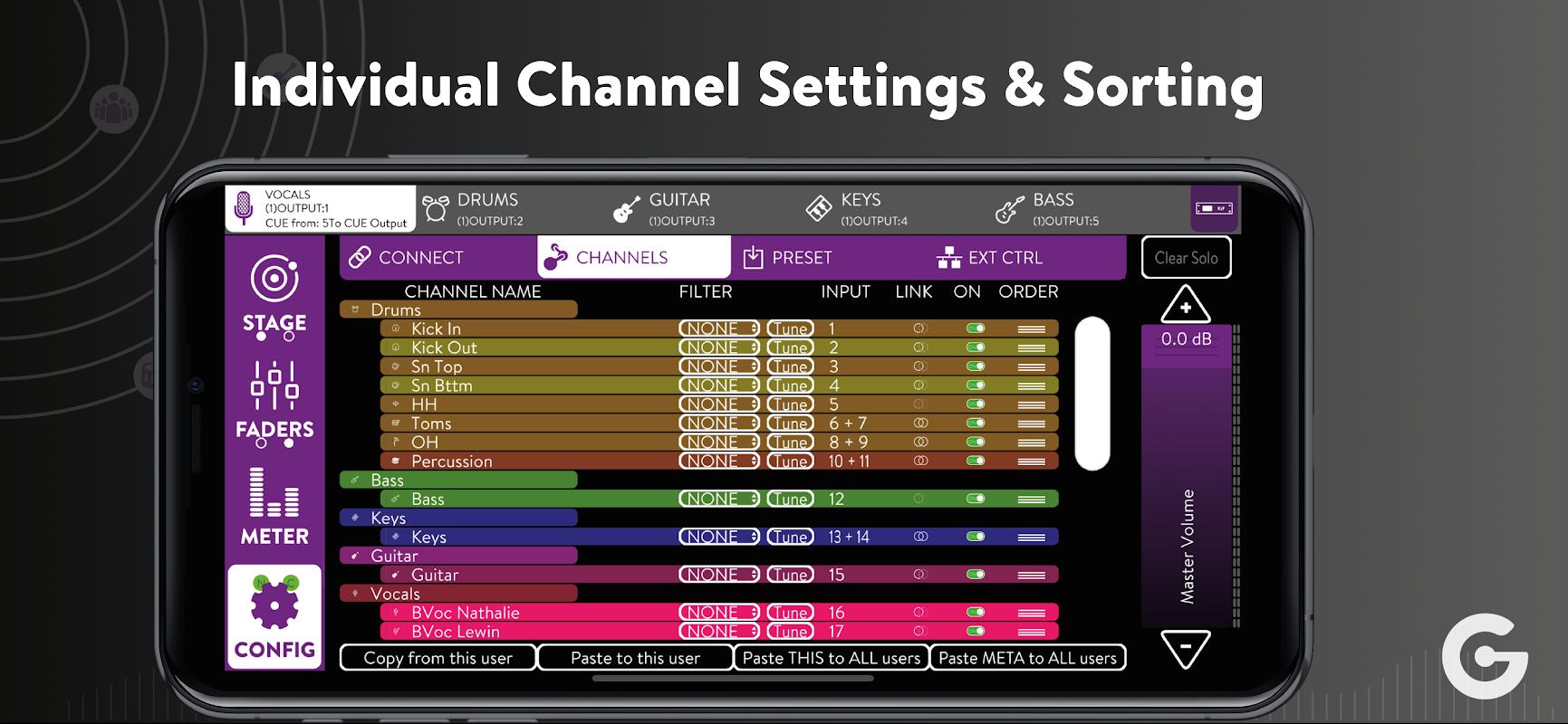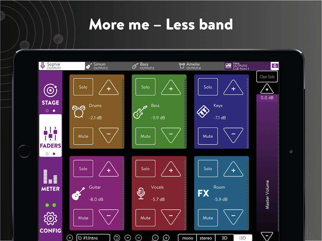通過拖放將每個樂器放置在您頭部周圍以及上方和下方的任何位置。在傳統立體和 3D 之間進行選擇。一些世界上獲得最高榮譽的音響工程師與我們合作,同時根據他們的日常需求量身定制一切。音樂家和音響工程師現在可以同時實時處理單獨的混音。