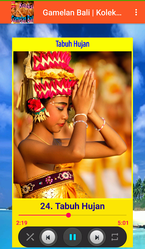 享受巴厘島流行的加美蘭 (Gambelan) 音樂的最佳集合,如 Galang Kangin、Peteng Bulan、Saput Apeteng、Bebataturan Suling、Jegul Tabuh、Wayang Delem 等。 Best Balinese Gamelan Collection 是典型的巴厘島藝術。體現巴厘島文化之美的巴厘島傳統音樂。 Best Balinese Gamelan 系列包括各種類型的巴厘島傳統藝術,如 Bleganjur、Gong Kebyar、Tabuh、巴厘島 Gamelan、巴厘島木偶等等。在您的安卓設備上享受巴厘島的氛圍和文化。享受傳統巴厘島音樂的神奇而美妙的伴奏。